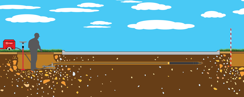 A small pit measuring approximately 2.5ft by 1ft is created and an air-driven device is used to punch through soil to a secondary pit to produce a tunnel in a similar way to those created by a mole. This system leaves a perfectly prepared route for new mains water pipes to be laid.